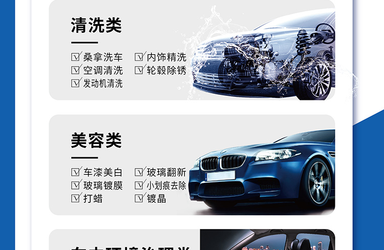 服務(wù)包括清洗類(桑拿洗車、內(nèi)飾精洗、空調(diào)清洗、輪轂除銹、發(fā)動(dòng)機(jī)清洗)、美容類(車漆美白、玻璃翻新、玻璃鍍膜、小劃痕去除、打蠟、鍍晶)、車內(nèi)環(huán)境治理類(內(nèi)飾香薰、新車除醛、負(fù)離子車內(nèi)凈化)、搶險(xiǎn)救援類(車胎補(bǔ)氣、輪胎更換、補(bǔ)胎)等。